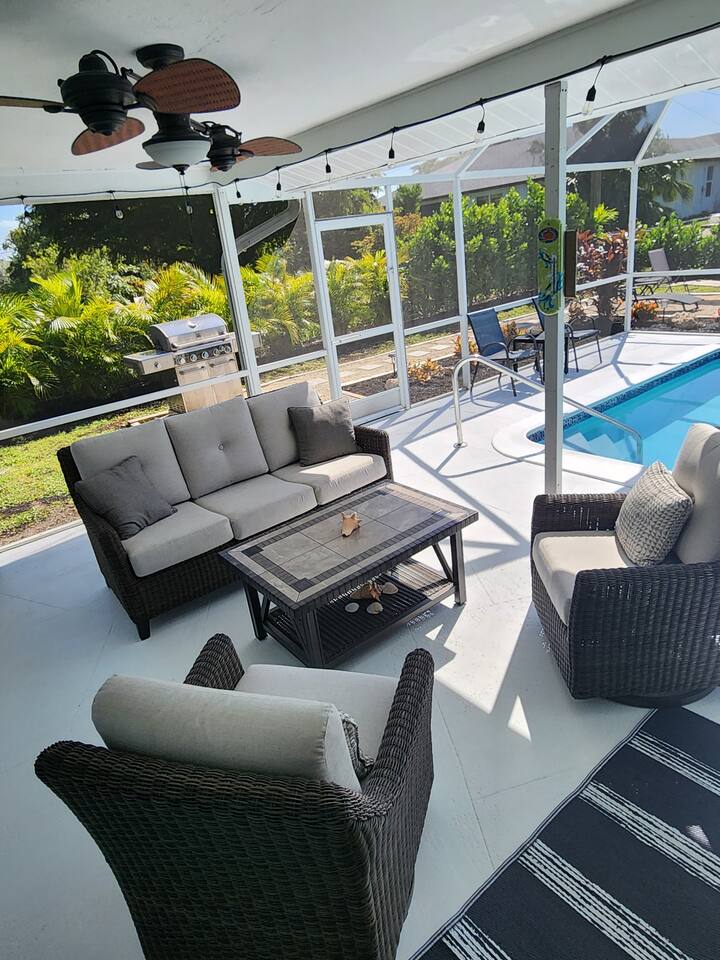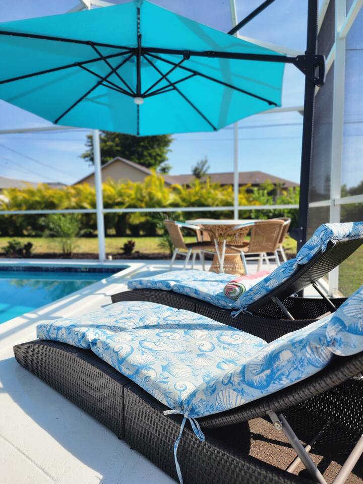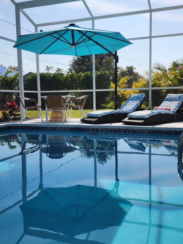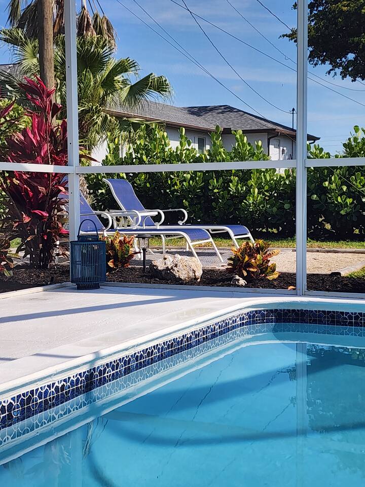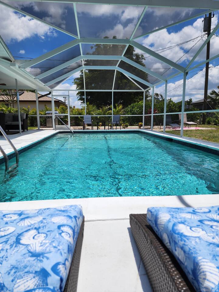 Welcome to "Feelin' Beachy" 3BR/2BA hideaway! Bask in your sunny🌞 south-facing, totally private 🌴heated pool paradise right in SE Cape Coral. We've filled it with beachy touches & everything for your laid-back escape. Minutes from Downtown Cape, shops, waterfront eats, bars and the Cape Coral Yacht Club Beach. ✈️29 mi to Punta Gorda (PGD) ✈️17 mi to SWFL Intl (RSW) 🍻2 mi to Cape Coral Ent. District 🏖️13 mi to Fort Myers Beach 🏫12 mi to Historic Downtown Fort Myers Dive in & unwind 🌊🏖️